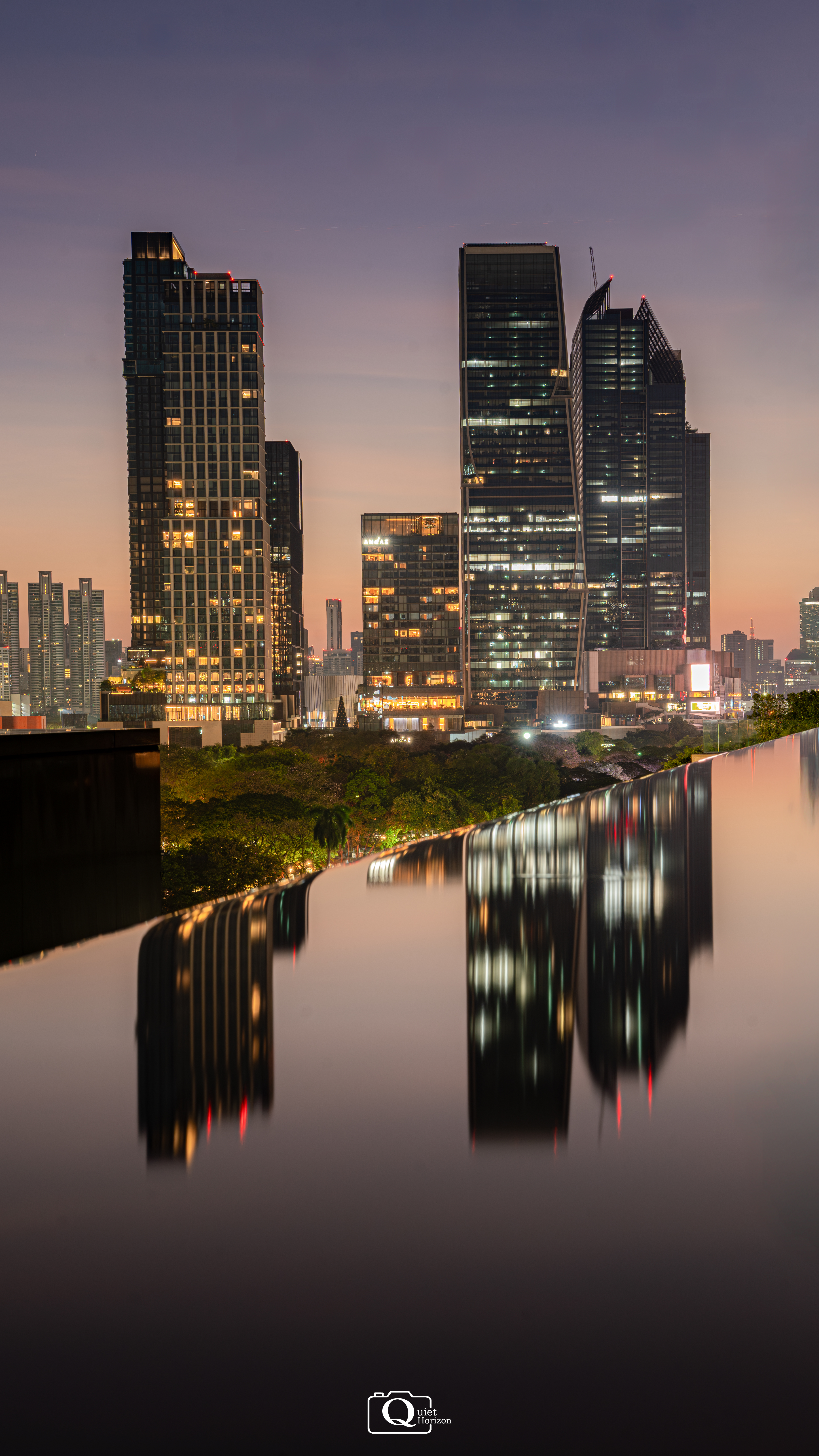 Use the pool as a mirror. Lower the camera to the water level and keep it close to the surface. Arrange it so that One Bangkok is at the right side of the frame.