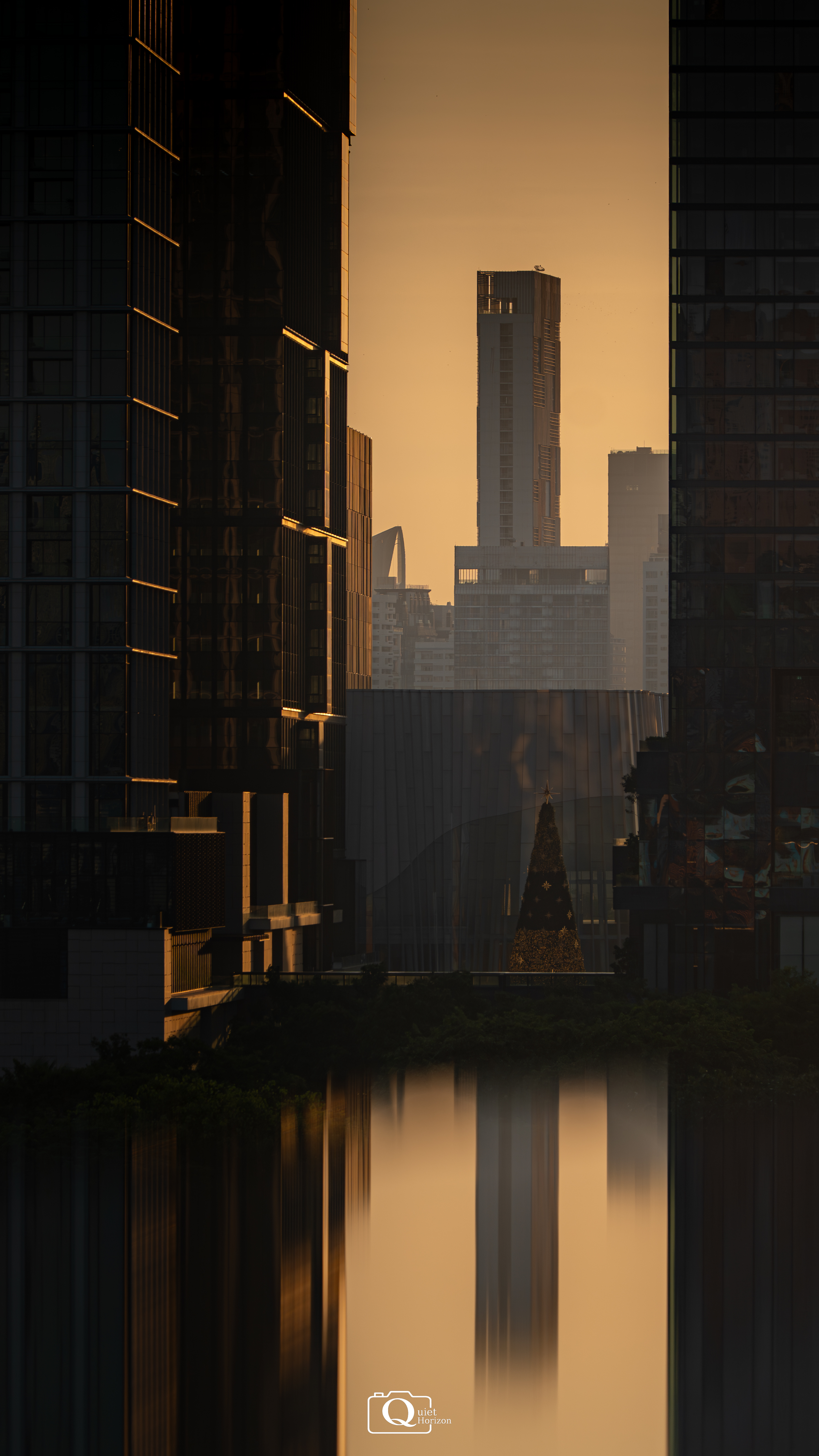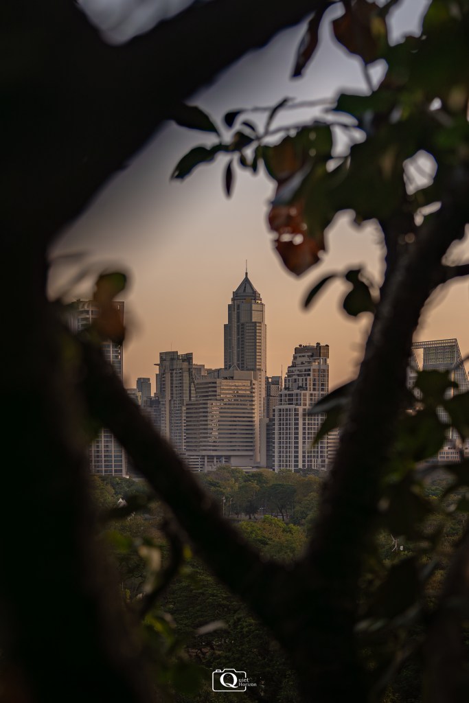In this shot, the trees act as a foreground frame, enclosing the buildings behind them. This draws the viewer’s attention towards the building while making the city feel contained rather than overwhelming.