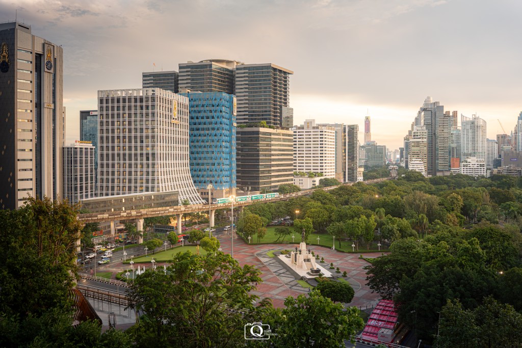 From this spot, the park stretches across the frame, balanced by the surrounding buildings – a classic Bangkok city-park composition